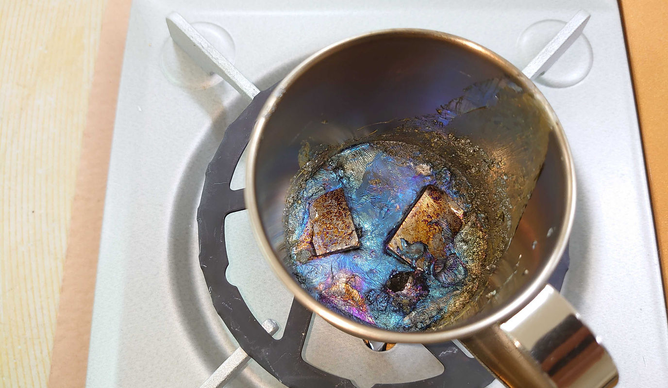 ガスコンロの上にステンレス鍋(今回はカップ)を置き、そこに材料を入れ火にかけて溶かし、樹脂型に流し込みます。